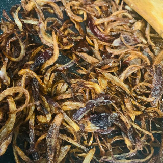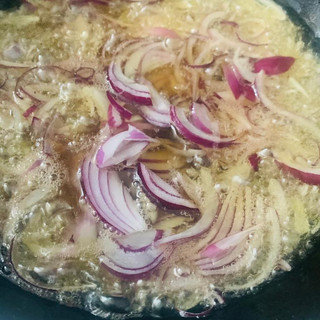 👉Cut 4 medium onions length wise fine, deep fry it until nice and brown,keep it aside.