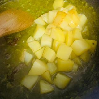 👉Add in a cup of water and salt now add the fried potatoes and the remaining 1 cup peas mix it altogether,cover the lid and cook it for 5 mins ,before turning the flame off add in green chillies and the tasty dish is ready to eat with chapati/rice/ poori/naan.